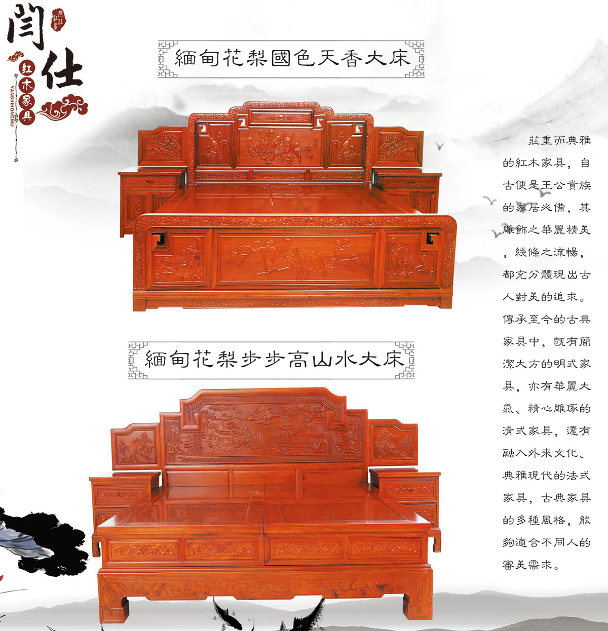 緬甸花梨步步高山水大床