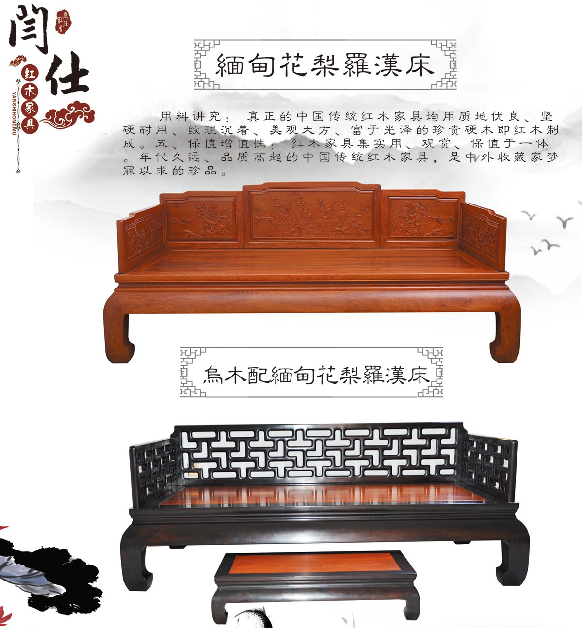 烏木配緬甸花梨羅漢床